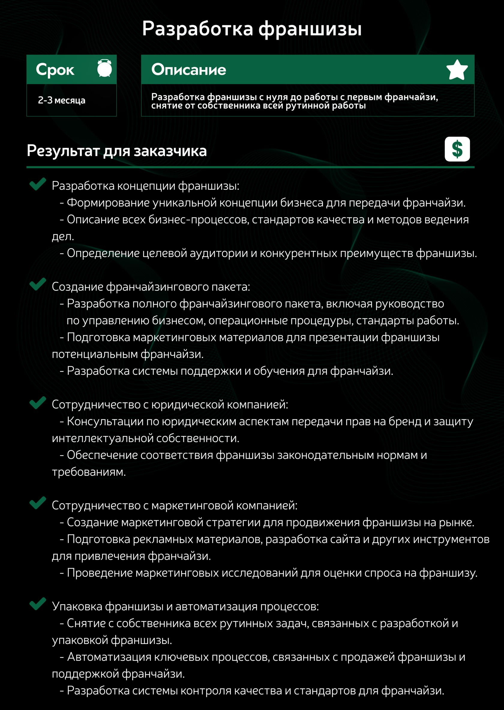 - Разработка системы контроля качества и стандартов для франчайзи.