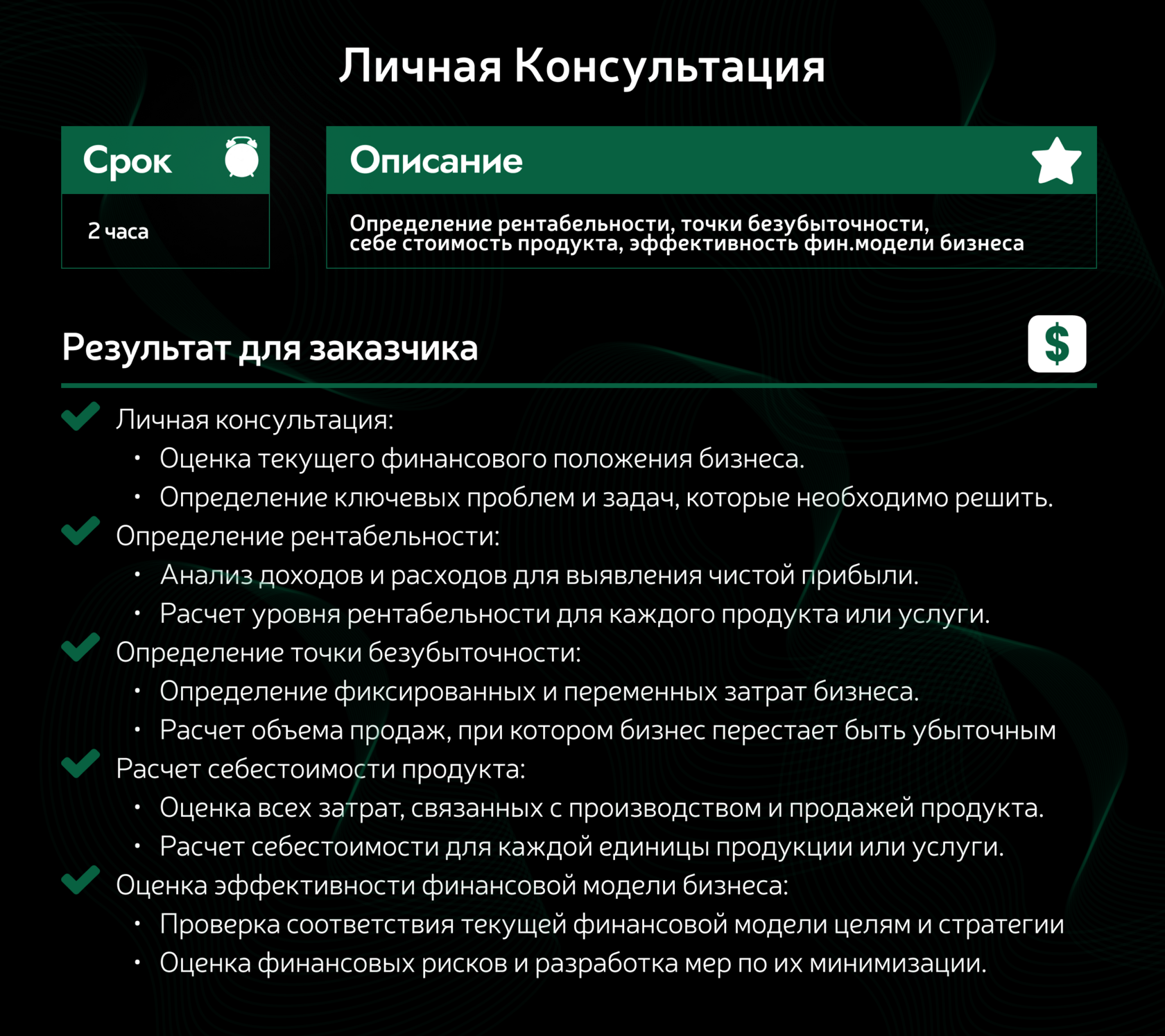 Оценка текущего финансового положения бизнеса. Определение ключевых проблем и задач, которые необходимо решить. Определение рентабельности: Анализ доходов и расходов для выявления чистой прибыли. Расчет уровня рентабельности для каждого продукта или услуги. Определение точки безубыточности: Определение фиксированных и переменных затрат бизнеса. Расчет объема продаж, при котором бизнес перестает быть убыточным Расчет себестоимости продукта: Оценка всех затрат, связанных с производством и продажей продукта. Расчет себестоимости для каждой единицы продукции или услуги. Оценка эффективности финансовой модели бизнеса: Проверка соответствия текущей финансовой модели целям и стратегии Оценка финансовых рисков и разработка мер по их минимизации.